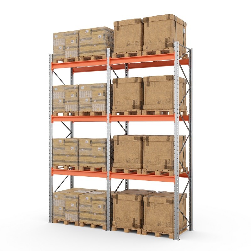 2 секции паллетного фронтального стеллажа, соединенные в линию на общих стойках.