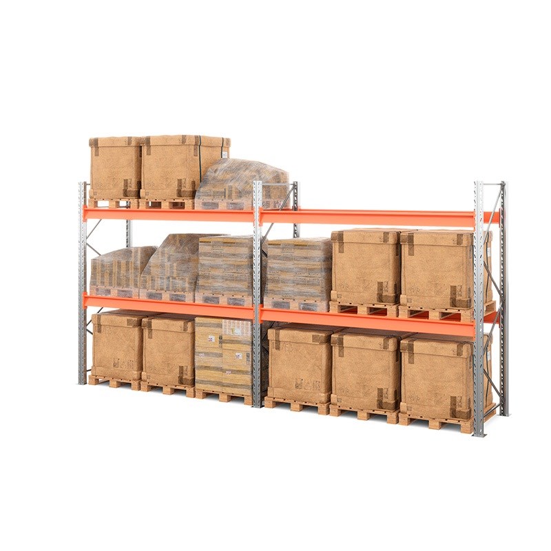 2 секции паллетного фронтального стеллажа, соединенные в линию на общих стойках.