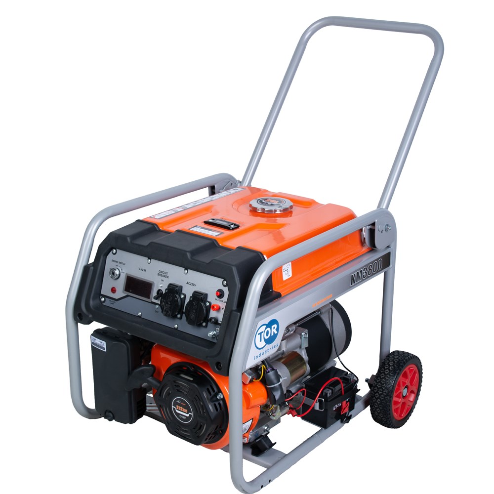 Генератор бензиновый TOR KM3800H 2,5кВт 220В 16л с кнопкой запуска и колесами. Мощная модель, которая подойдет не только для бытового, но и профессионального использования, например, в строительстве и производстве. Вместительный бак на 16 литров бензина и время непрерывной работы 10ч обеспечат потребителя стабильным током напряжением 220в на продолжительное время. Кнопка запуска с электростартером облегчает процесс запуска генератора, для максимально комфортного использования. Наличие колес в комплекте позволяет транспортировать генератор весом 53кг без особых усилий. Сфера применения: частные дома, мастерский, производственные площадки, строительные, бурильные работы, проведение мероприятий на открытом воздухе. Подробные технические характеристики представлены в таблице: