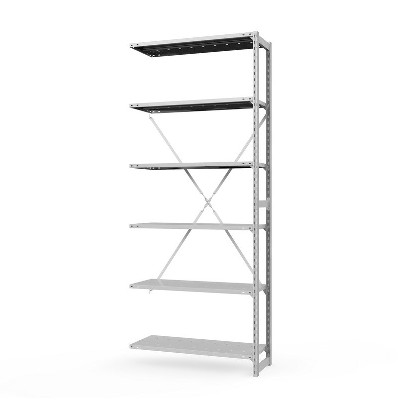 Приставная секция полочного стеллажа ТСУ Универсал. В отличие от стандартной секции, у приставной отсутствуют стойки с одной стороны: секции монтируются в линию на общих стойках, что позволяет облегчить и удешевить стеллажную конструкцию.