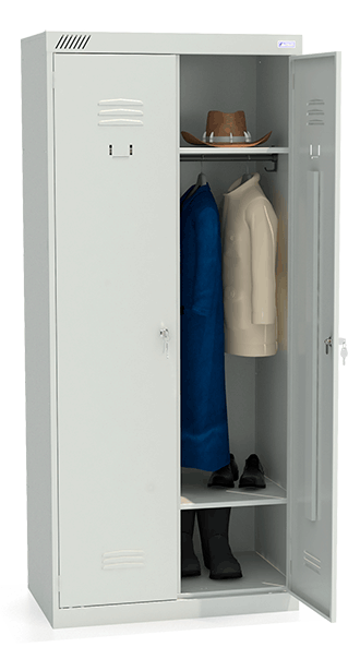 Созданный из высококачественного металла, этот шкаф обладает сборным корпусом, который надежно скрепляется на заклепках, гарантируя устойчивость и долговечность конструкции. Его внушительные размеры – высота 1830 мм, ширина 800 мм и глубина 500 мм – позволяют разместить большое количество вещей. Внутри шкафа расположены две вместительные секции, каждая из которых оборудована двумя прочными перекладинами для вешалок, а также четырьмя удобными полками для сложенной одежды или аксессуаров. Для дополнительного удобства предусмотрено четыре крючка для одежды.