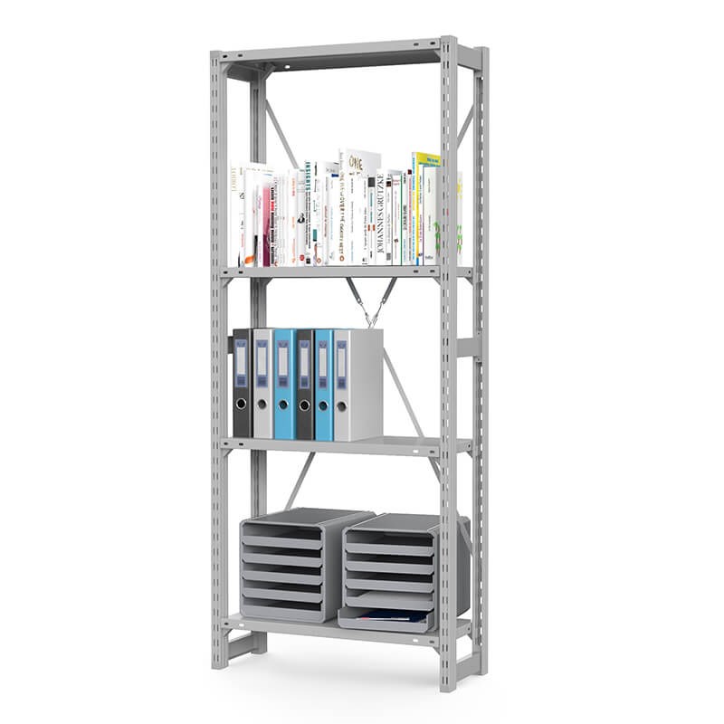 Стеллаж комплектуется сплошными металлическими полками, покрыт порошковой полимерной краской светло-серого цвета (RAL 7035).