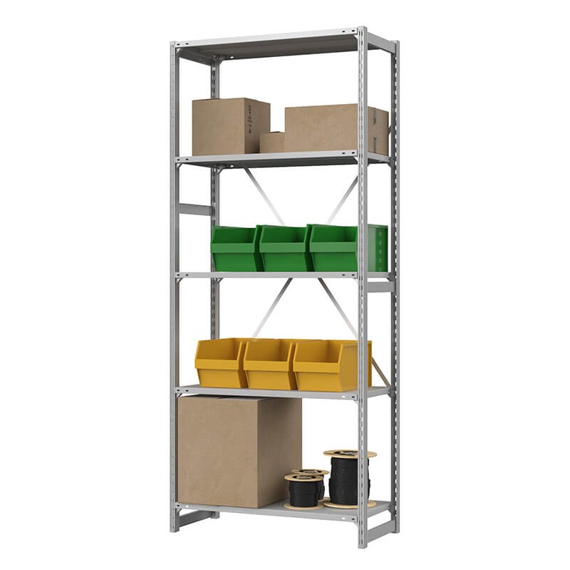 Стеллаж комплектуется сплошными металлическими полками, покрыт порошковой полимерной краской светло-серого цвета (RAL 7035).