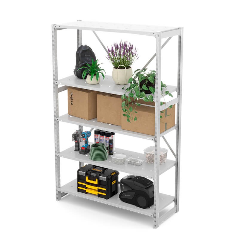 Стеллаж комплектуется перфорированными металлическими полками, покрыт порошковой полимерной краской светло-серого цвета (RAL 7035).