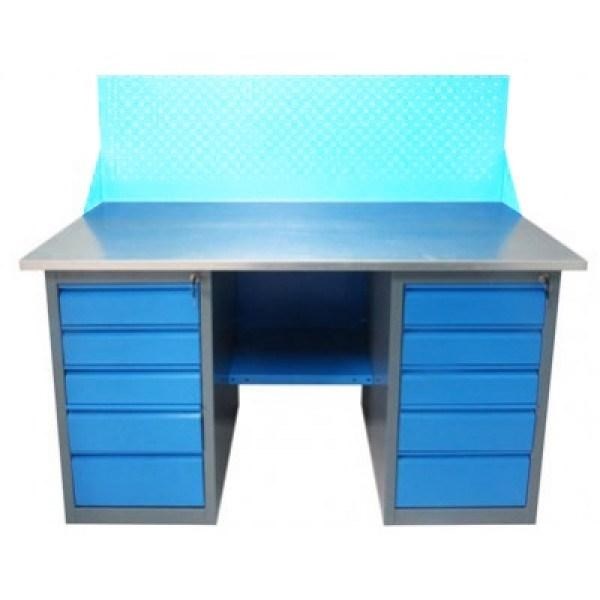 Верстак имеет надежную модульную конструкцию с усиленной столешницей (плита МДФ 25мм, покрытая листом оцинкованного металла). Верстак используется, не только в качестве рабочей поверхности, но и для хранения всевозможных инструментов. Верстак укомплектован двумя драйверами, каждый из которых оснащен пятью выдвижными ящиками разными по высоте. В драйвере для выдвижения ящиков используются шариковые направляющие полного выдвижения. Для одновременной блокировки всех ящиков установлен центральный замок. Максимально равномерно-распределенная нагрузка на ящик 30кг. * инструментальная панель в комплект не входит. Слесарные столы (верстаки) применяются для выполнения сборки и слесарных работ в специализированных мастерских, гаражах и разнообразных образовательных заведениях. Верстак (слесарный стол) – это важный предмет мебели для оснащения производственных помещений. Высокая надежность, долгий период службы и эргономичность конструкции верстаков (слесарных столов) предназначена организовать рабочие места ваших работников комфортными, уменьшить время простоев из-за беспорядка и розыска нужного инструментария и оснастки. Ввиду их функциональных возможностей и наличию качественной рабочей поверхности, верстаки (слесарные столы) можно применяться для большей части разнообразных видов работ: слесарные, монтажные, рихтовочные, комплектовка и д.т. Поставляется в разобранном виде.