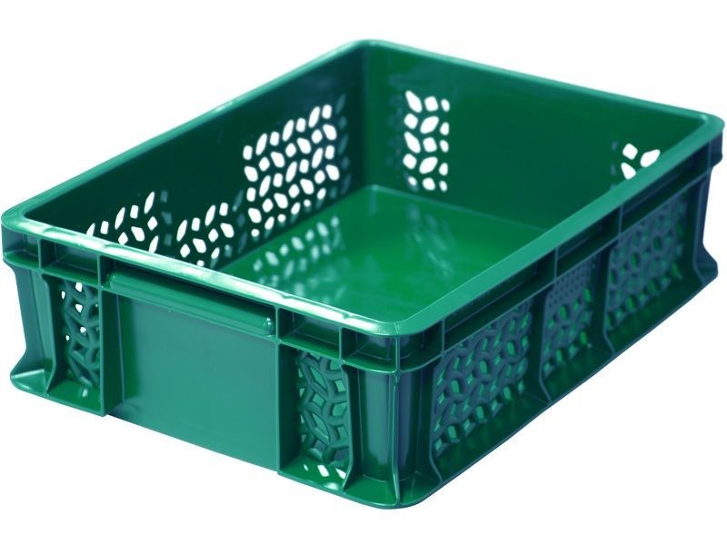 Ящик п/э 400х300х120 дно сплошное, стенки перфорированные, с внешней ручкой цв. зелёный (701.02.02)