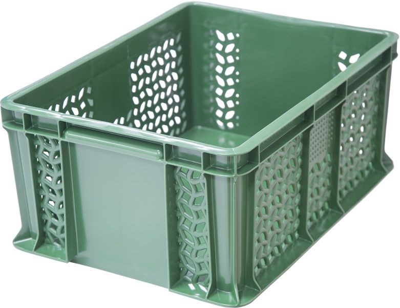 Ящик п/э 400х300х180 дно сплошное, стенки перфорированные, с внешней ручкой цв. зелёный (702.02.02)